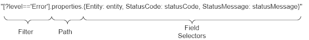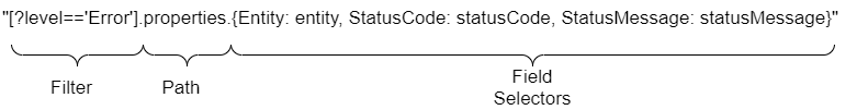 - Filter - [?level='Error'] - the first piece is surrounded with square braces which mean that we are dealing with JSON array. Inside of braces with have expression starting with question mark - it is responsible for filtering out object which do not meet the condition - level property of the object must be equal to Error. To sum up, the filter expression here will go through array of objects and filter out these object where level property has value other than Error.